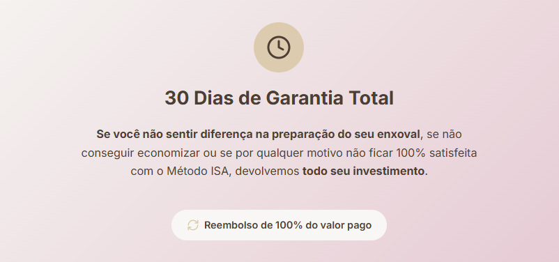 Você tem 30 dias para testar o método. Se não ficar satisfeita por qualquer motivo, devolvemos 100% do seu investimento, sem burocracia.